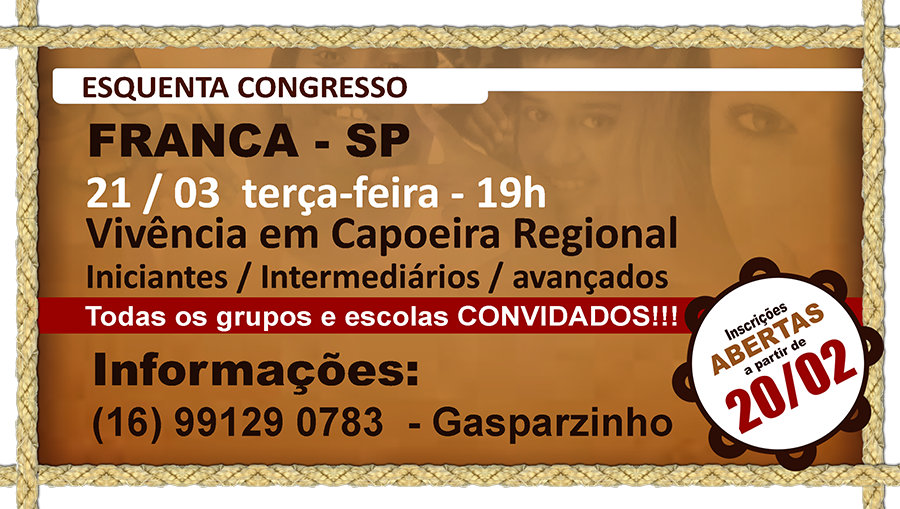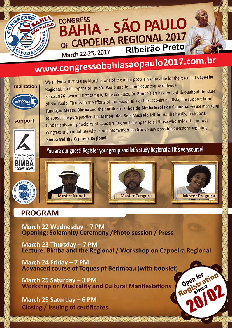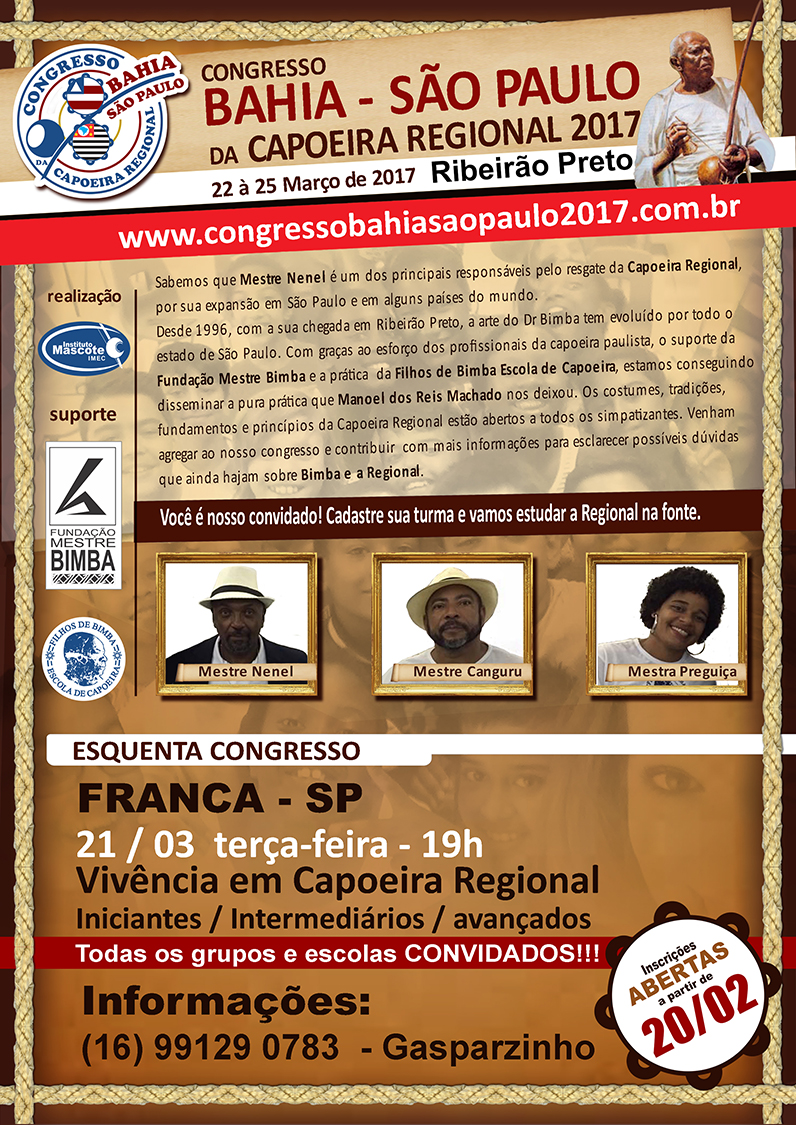Sabemos que Mestre Nenel é um dos principais responsáveis pelo resgate da Capoeira Regional, por sua expansão em São Paulo e em alguns países do mundo. Desde 1996, com a sua chegada em Ribeirão Preto, a arte do Dr. Bimba tem evoluído por todo estado estado de São Paulo. Com graças ao esforço dos profissionais da capoeira paulista, o suporte da Fundação Mestre Bimba e a prática da Filhos de Bimba - Escola de Capoeira, estamos conseguindo disseminar a pura prática que Manoel dos Reis Machado nos deixou. Os costumes, as tradições, fundamentos e princípios da Capoeira Regional estão abertos a todos os simpatizantes. Venham agregar ao nosso Congresso e contribuir com mais informações para esclarecer possíveis dúvidas que ainda hajam sobre Bimba e a Regional.